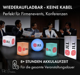 Unsere Lichter haben eine Akkulaufzeit von 8 Stunden, sodass sie während Ihrer Veranstaltung beleuchtet bleiben.