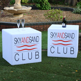 Personalisierter Tisch Sitz mit beleuchtetem Markenzeichen, Leuchtwürfel freistehend warmweiss