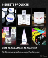 Dieser Würfel ist als kundenspezifische Lichtwerbung mit hintergrundbeleuchtetem Unternehmens-Logo verwendbar – eine Leuchtreklame, die sicher bei Ihrem nächsten Event oder Ihrer nächsten Konferenz für Gesprächsstoff sorgen wird.